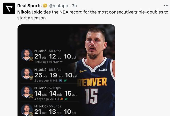 开季4连三双追平三双王,约基奇升至历史第一!揭幕战憾负勇士后,掘金队豪取3连胜喜迎3大利好再度争冠,2换1神交易更是大赚特赚。